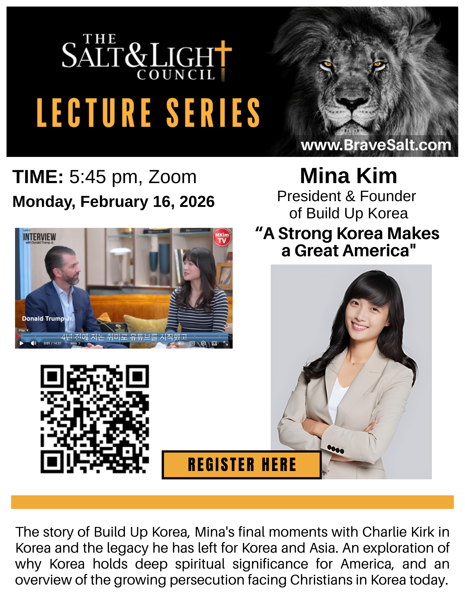 bold vision for truth and liberty. Through her media platform, MKIM TV,” she has reached over 200,000 subscribers, providing accurate, conservative news coverage tp Korean audiences hungry for truth. Inspired by Charlie Kirk, in 2023 she founded Build Up Korea (BUK), a youth conservative organization that has mobilized thousands of young Koreans and Korean Americans to stand for faith, freedom and traditional values. Also, as the head of the Build Up Foundation, Inc., she works to raise up the next generation of Korean-American leaders who will defend Jude-Christian principles in Asia and beyond. Mina also served as president of EveryLife South Korea from 2024-2025.