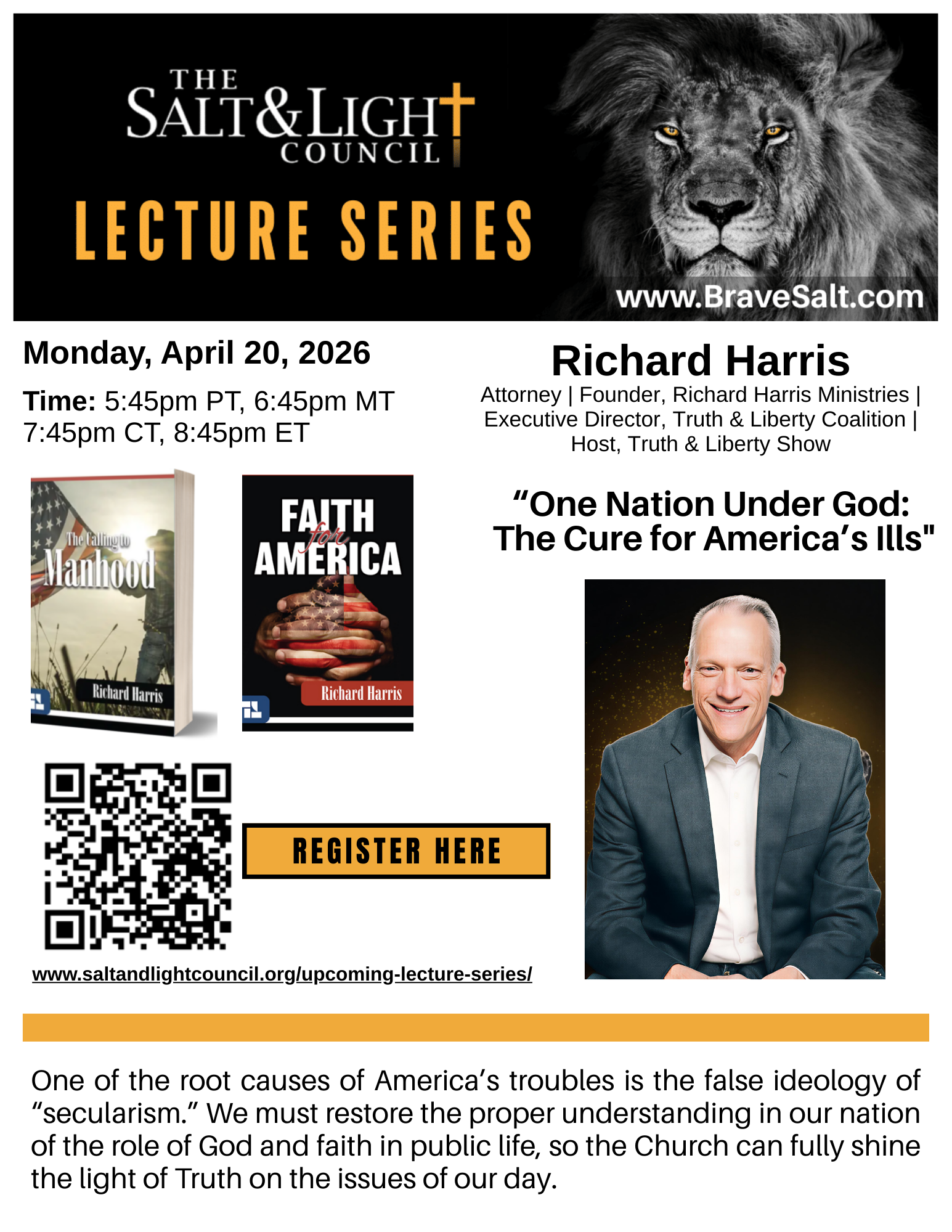 A licensed attorney, Richard has represented clients at all levels of state and federal courts, including the United States Supreme Court. Richard also served as the General Counsel for Andrew Wommack Ministries, Inc. He is the author of The Calling to Manhood (2024), Faith for America (2025), Vision for America (2026) and the Law of Adoption (2026), and producer and narrator of the nationally broadcast documentary Hope for the Future (2024).
